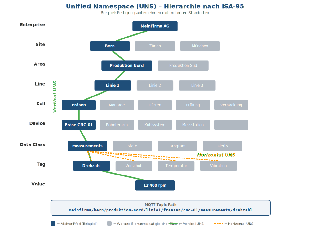 Vertical UNS (grüne Linie) – Der Pfad von der Enterprise-Ebene bis zum einzelnen Messwert. Er bildet die hierarchische Zugehörigkeit ab: «Dieser Drehzahl-Wert gehört zur Fräse CNC-01, in der Zelle Fräsen, auf Linie 1, im Bereich Produktion Nord, am Standort Bern, der Firma MeinFirma AG.»